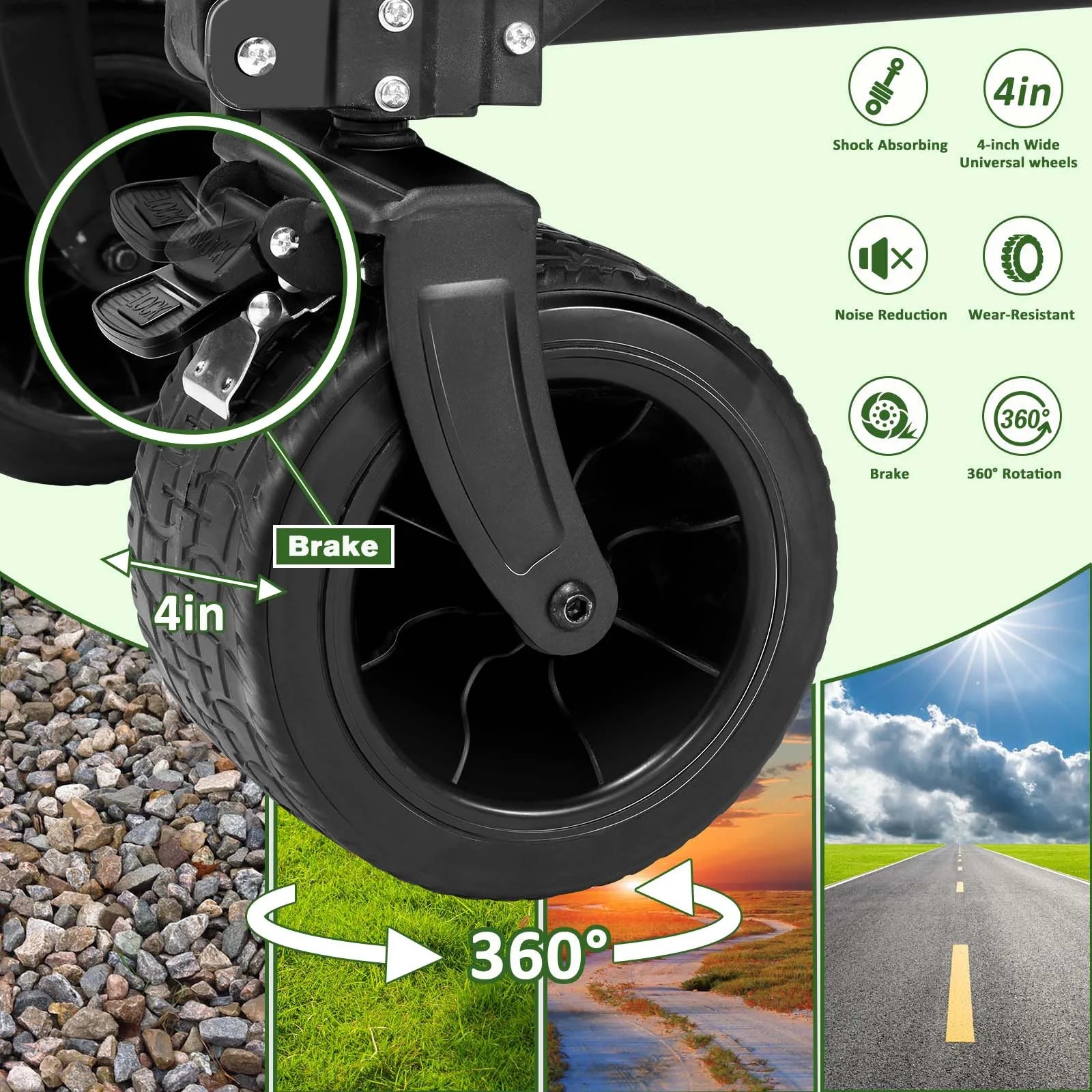 - All-terrain wheels that glide over sand, gravel, grass, and pavement